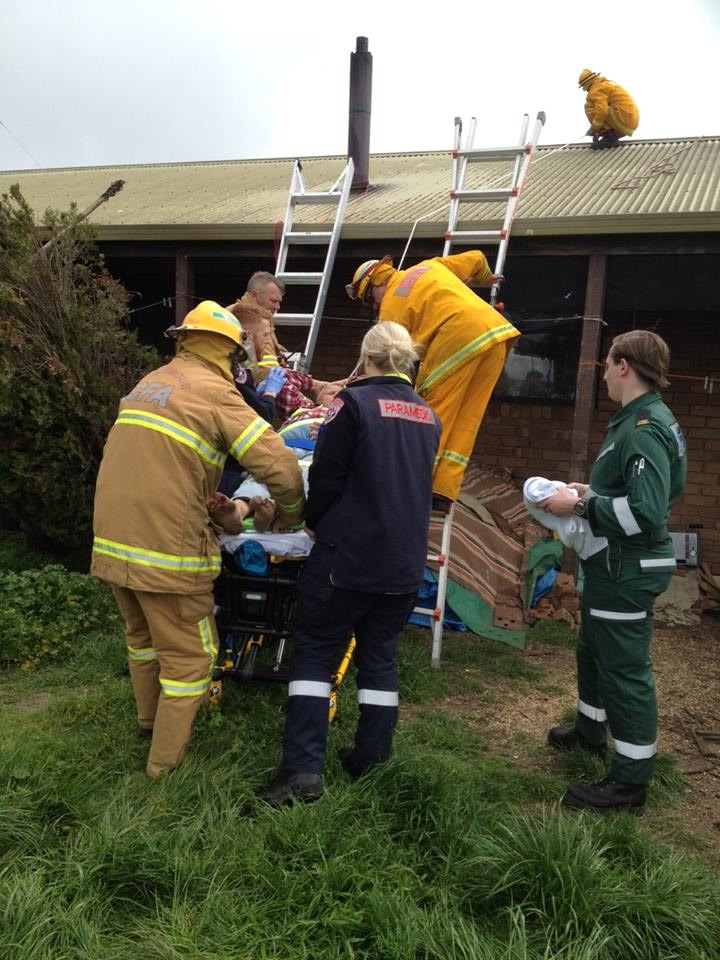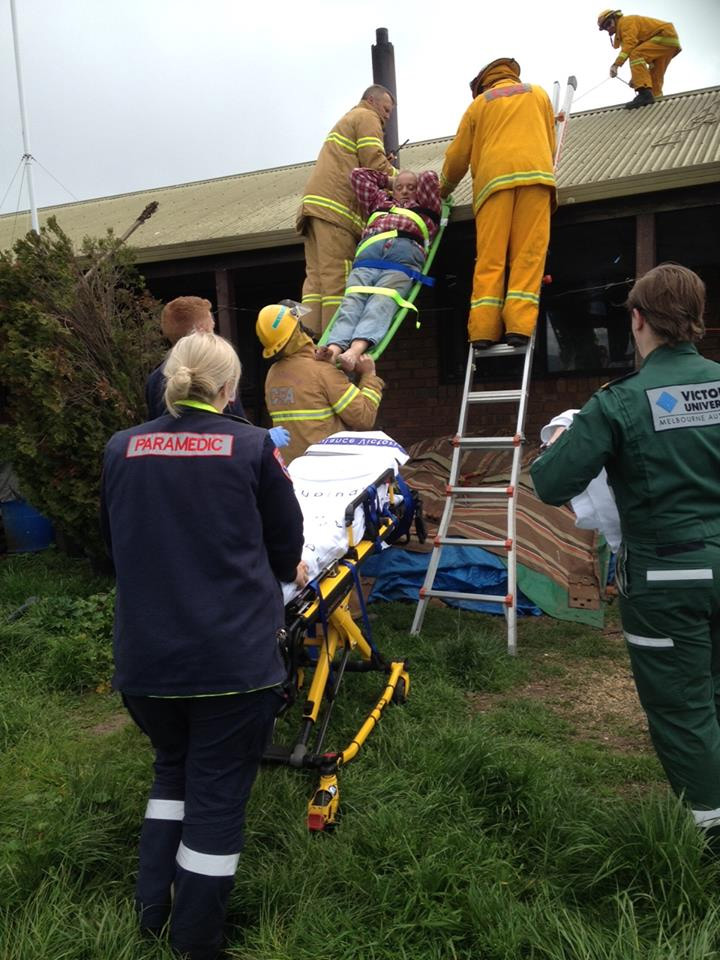 This afternoon we were called to an elderly man injured on a roof. The man had been cleaning his chimney and was hit by a strong gust of wind, injuring his leg and foot. It was decided the best way to get him down was to strap him onto a board and carefully lower him onto a waiting stretcher. The ambulance then took him to Kyneton hospital for checking. We advise all people to be very careful when working on a roof or with ladders, especially the elderly. A job well done team!