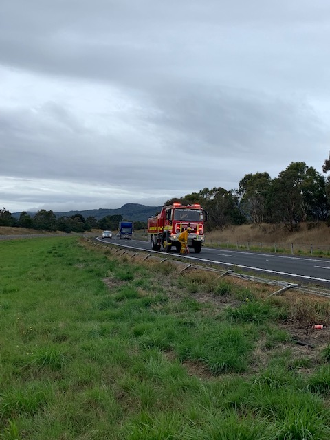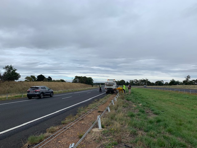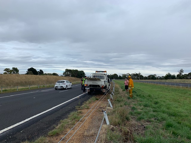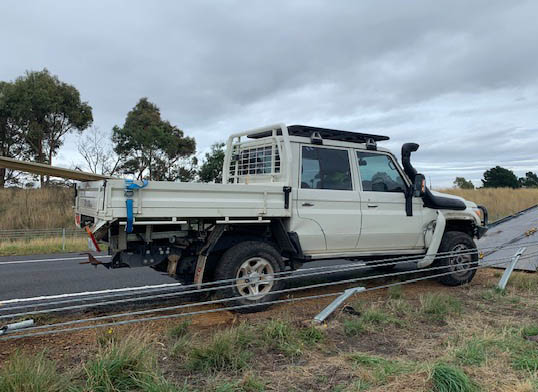 At 10.30 this morning Woodend T1 was called to an MVA on the Calder Freeway. On arrival we found a single ute had collided with the side barriers of the freeway, preventing it from veering into oncoming traffic. The 000 call included reports that diesel had been spilt. When on scene, we found that the side and undercarriage of the ute had been significantly damaged by the wires, including a hole in the top of the fuel tank. The crew made quick work of the hole, patching it up in no time. Woodend T1 stood by as the ute was loaded up and towed away. Luckily no one was injured except for some sore barriers.