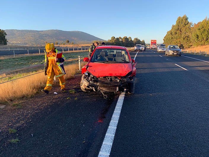 Just after 8am this morning we were called to an MVA on the Calder Freeway just north of Woodend. On arrival we found a small car had crashed into the central barrier and continued to rest 50 metres down the road. Fortunately the young female driver was OK, and taken away by ambulance as a precaution. Woodend FCV and T1 remained on scene until all was cleared. A reminder to take care on frosty, sunny mornings.