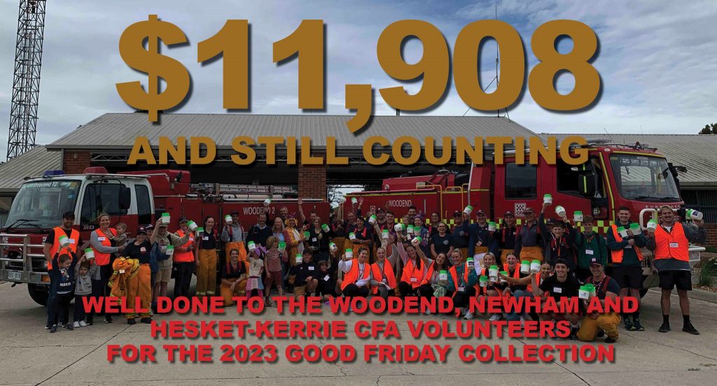 Once again, the Woodend, Newham and Hesket-Kerrie CFA Brigades conducted the annual Good Friday Collection for the Royal Children’s Hospital Appeal. A special thanks to all residents and visitors who donated so generously, raising a total of $11,908 – including $9,315 for Woodend, $1,729 for Hesket-Kerrie and $864 for Newham. A huge thank you to the Catering Crew of the Woodend CFA who ensured that all were well fed and watered, and those who helped with sorting and counting on the day.A special thank you ALSO to the team at the Bendigo Bank in Kyneton who assisted in the final money count.Unfortunately, we were not able to cover every home, so If we missed your house, you can also still donate online through the Virtual Tin Shake – simply go to https://fundraise.goodfridayappeal.com.au/fundrai…/Woodend. It’s so easy to do and your donation will add to the Woodend total.A great effort by everyone involved.