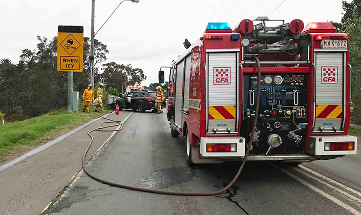Just before 6pm last evening, Woodend and Macedon were called to an MVC on High Street in Woodend, with smoke issuing from a vehicle. Woodend Pumper was first on scene, quickly followed by Woodend Tanker 1, with Macedon Tanker released. The crash was actually on the railway bridge forcing the road to be blocked in both directions. Woodend volunteers made sure the scene was safe until the tow truck could clear the vehicle away. They then cleared the road of debris before it could again be re-opened after more than an hour. In the meantime, the driver had fled the scene, with Police following up once the scene was clear.