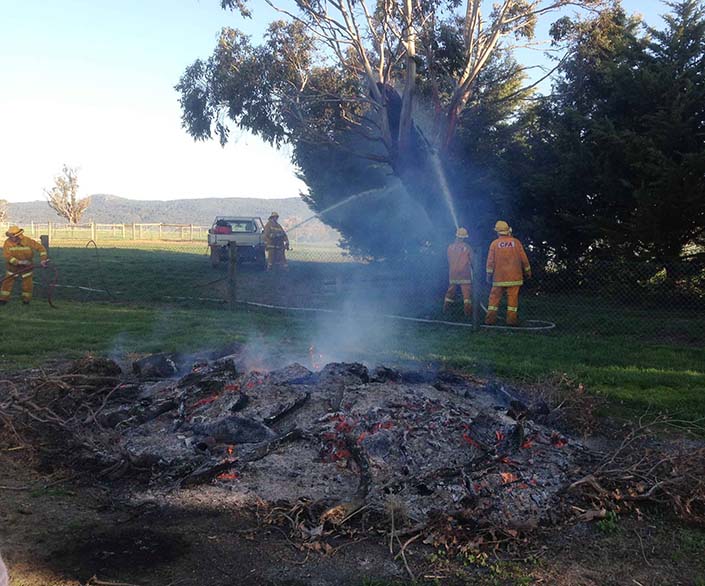 Yesterday afternoon we were called a grassfire spreading in North Woodend. It turned out the property owner was burning a large pile when strong winds blew embers into a nearby gum tree, which then caught fire. Crews from Woodend, Newham and Hesket were involved in bringing the tree and burn pile under control, which took about an hour. Whilst we encourage property owners to clean up and burn off before restrictions come into place, it is not a good idea to burn on a day of extremely strong winds!