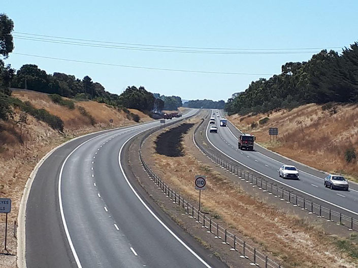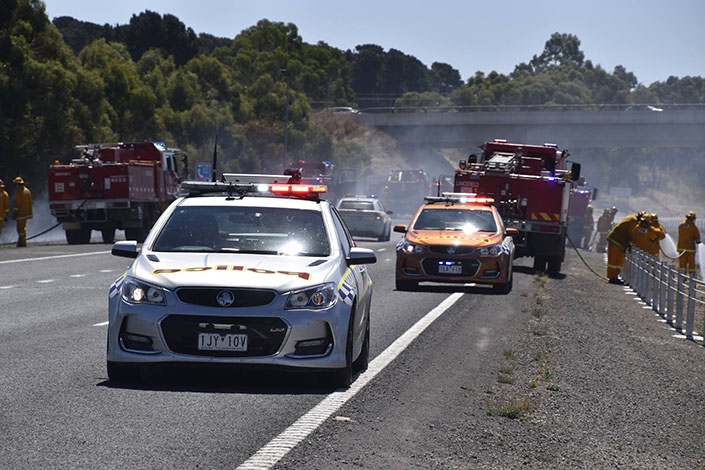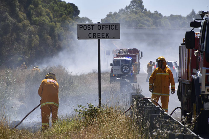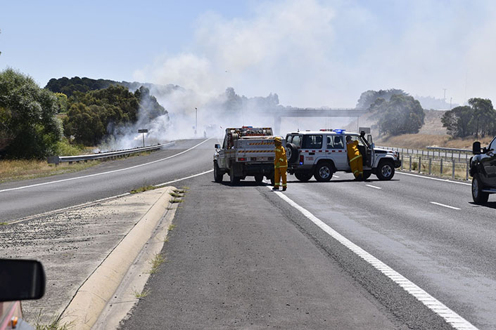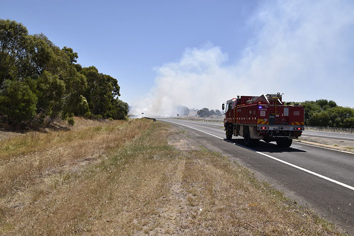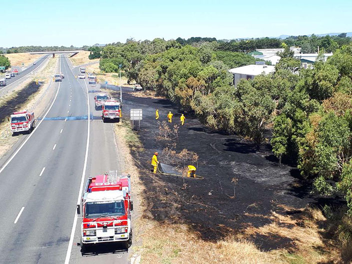 At approximately 2:30pm Firefighters from 18 Brigades around the district responded to reports of multiple grass fires on the Calder Fwy around Post Office Creek.