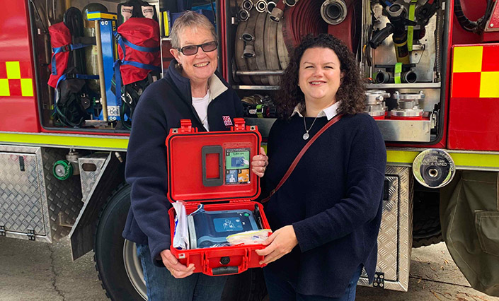 Gail Jones wanted to make a donation to the Woodend CFA at a recent market, but was unable to do so on the day. We suggested she drop into the fire station the next day during our Sunday roster. When she arrived the only person at the station was Secretary Annette van Huffel. Gail asked if there was anything special the Brigade needed and Annette said we were looking at purchasing a Defibrillator. Gail then asked how much was needed and when Annette mentioned the amount, Gail covered the cost immediately. The Brigade has now purchased the Defib Machine which has been placed on our new Tanker. Gail recently dropped into the station where she was photographed with Annette and the new purchase. A very special donation from a very special person. Thanks Gail.