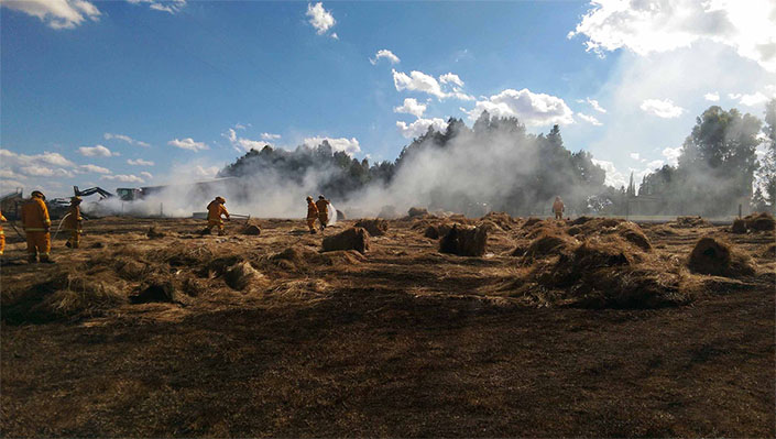 On Saturday afternoon Woodend crews were called to a Hay Bale Fire in North Woodend. The fire was started by a mechanical issue with a ride-on mower, and quickly spread to burn around 1 acre of land and around 20 large round hay bales. Woodend T1, T2 and FCV was quickly joined by tankers from neighbouring brigades to bring it under control. The property owner also did a fantastic job with their own water unit and also a tractor to break up the bales. It took around 5 hours to contain and black out.