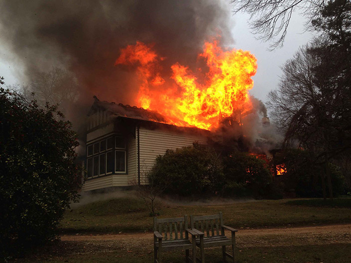 The fire was started by a log that had fallen from an open fire. Ironically the house was one of the few on that side of Mt Macedon Road that had survived Ash Wednesday. A timely reminder for everyone to check their winter safety plans, including working smoking alarms and solid fire guards.