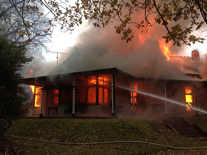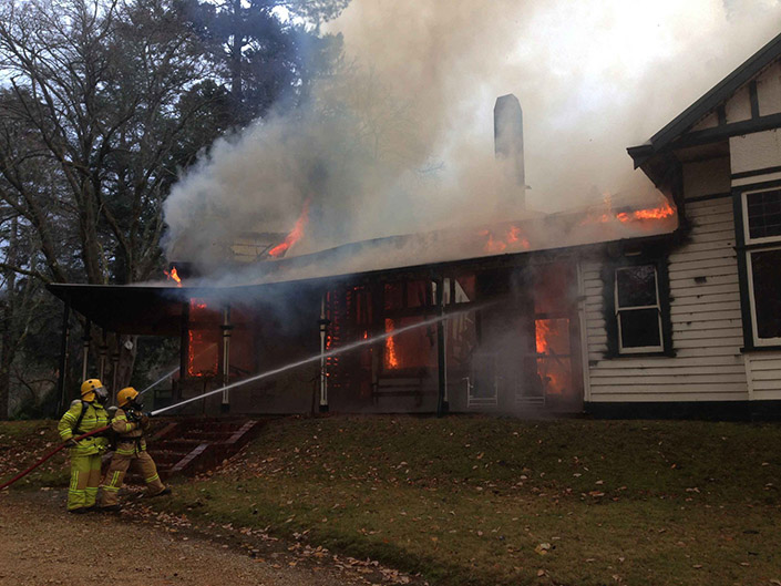 Just after 9.30am this morning we were called to a structure fire on Mt Macedon. We were asked to send Woodend Pumper with as many BA operators as possible. Fortunately all five crew members were BA credited. On arrival we found one of the mountains’ most historic 100 year old homes fully involved. Fortunately the 96 year old resident had been assisted from the building before the fire took hold. Appliances from Macedon, Mt Macedon, Woodend, Gisborne and Riddells Creek brought the fir e under control in about an hour, and remained on scene for several hours to ensure it was fully extinguished.