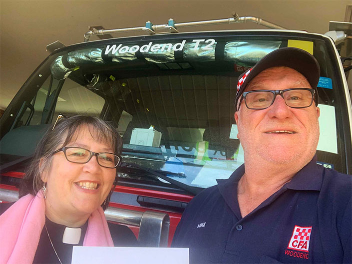 When the Anglican Parish of Woodend-Trentham heard that some Woodend CFA volunteers had volunteered to go north to help out our fellow fire fighters recently, they wanted to do something to show their appreciation. Over several weeks they had a collection in their church, which raised a very generous donation for the Woodend CFA. They said in their letter to the brigade that “Your siren each Sunday (at the same time as we begin church incidentally) reminds us that as we gather, you do too”. In an interesting twist, parishioner Norma Richardson is the grandmother of Ben Richardson, who is a Woodend CFA volunteer and was on their first deployment to NSW. Reverand Melissa Clark came down to the Woodend CFA this morning to present the donation to Captain Mike Dornau.