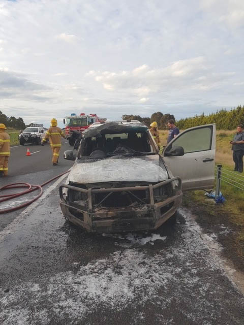 Due to the involvement and proximity to the grass on the edge of the freeway Woodend Lieutenant Steve Ritchie made the decision to set up the pumper on the north bound side and run a line across the wire barriers to the south bound lanes to attack the fire. Police were on scene and he requested they stop the traffic on the south bound lanes … which they did.