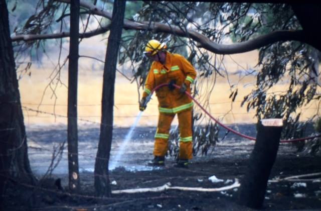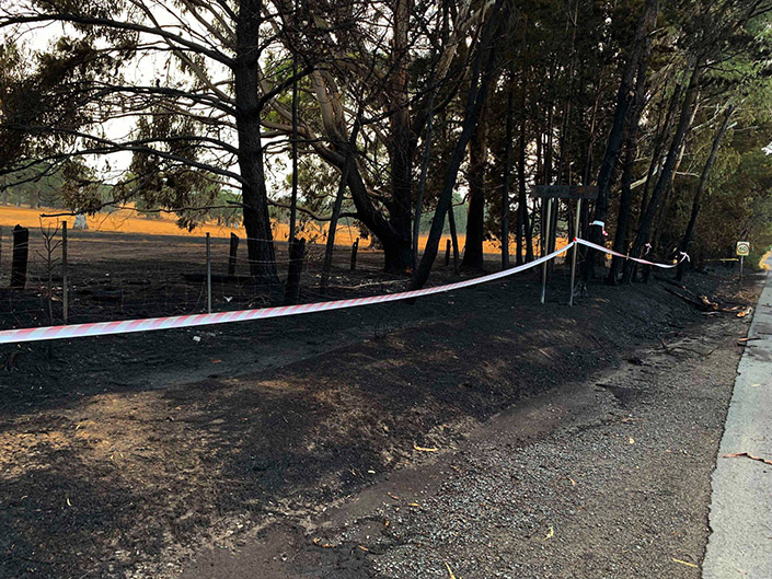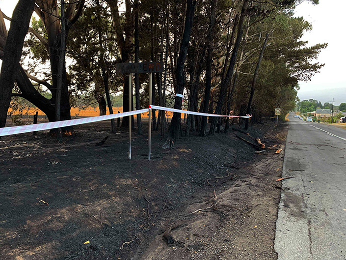 After the Old Lancefield Road fire was controlled, the Woodend T2 crew lof Geoff Wells, Mike Selby and Brad Newell remained on scene overnight to patrol the fire and put out any hot spots that flared up. They were joined at dawn by Captain Mike Dornau with some welcome breakfast and remained on scene until just after 9am. Police and CFA fire investigator were on scene at light to check out the scene along with Shire contractors who were needed to remove numerous dangerous trees. The road remained closed until late afternoon. A great effort by all involved to avert what could have been a major fire.