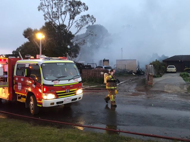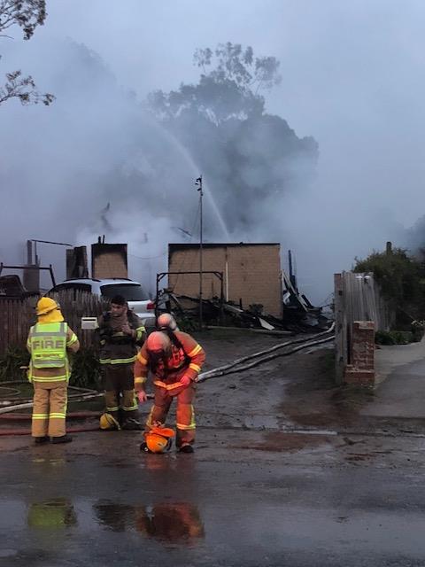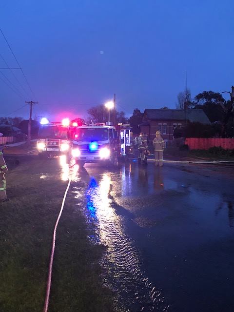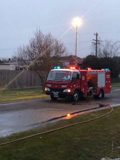 Woodend was called to assist Romsey with a fully involved structure fire, when called at 4.30am this morning. Woodend Support vehicle attended with its lighting tower and also hose ‘monitor’ to spray water on the structure from a distance due to asbestos fears. Woodend FCV also attended with our decontamination kit. Well done to crews from Romsey, Woodend, Lancefield, Riddell, Gisborne and Bolinda.