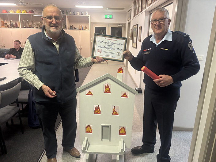 Thanks to the Woodend Men’s Shed, we have a fantastic new Children’s Fire House to help entertain the young ones and also start to educate them about fire behaviour. We had a similar unit at last year’s Woodend CFA Open Day which proved a huge success. So much so, that Woodend volunteer Cara Nolan approached the local Men’s Shed to create a similar unit for the brigade. The finished result was recently presented to Woodend CFA Captain Steve Ritchie by Woodend Men’s Shed member Kevin Davis (left), who was also a former member of the Woodend CFA. The Special House has little fires in different areas that can be hit with a special water pump. The new Fire House was put through its paces on the weekend and came through with flying colours. Thanks to everyone involved and here’s to entertaining and teaching children for many years to come.